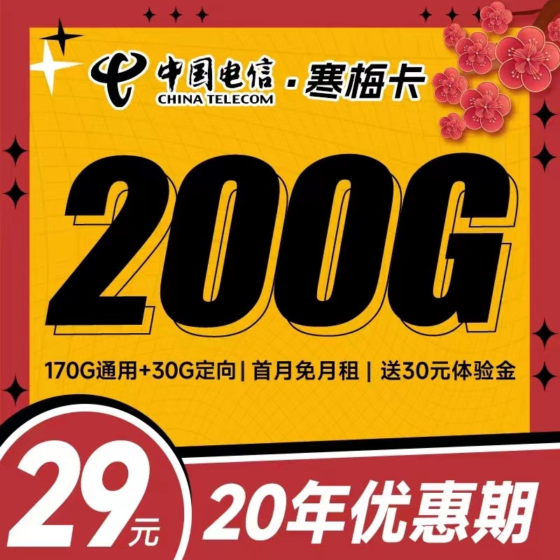 电信寒梅卡29元200G+黄金速率+支持结转+永久套餐归属地:吉林归属地不发货地区:新疆,西藏,云南,吉林,具体以运营商拦截为准备注:-配送方式:京东快递激活方式:上门激活首充渠道:激活30天内任意渠道累计充值100元即可办理年龄:20-55岁违停复机:根据运营商下发的短信操作套餐合约:无合约套餐构成:激活后首充100元,永久29元200G,首月免费使用,流量支持结转注销方式:支持异地注销、当地营业厅注销、中国电信APP线上注销