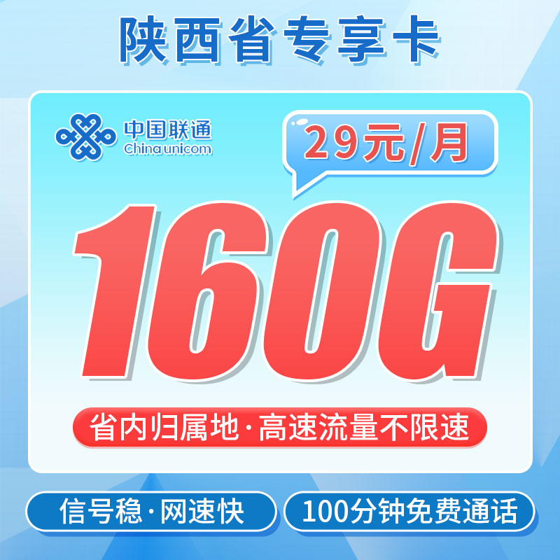 联通秦川卡29元160G+100分钟归属地:陕西不发地区:只发陕西备注:-配送方式:京东上门激活方式:-首充渠道:任意渠道办理年龄:18-60岁违停复机:根据短信操作套餐合约:24个月合约套餐构成:首月月租按天折算扣费,之后每月29元130G通用+30G定向+100分钟通话有效期24个月;到期根据运营商政策续约注销方式:支持异地注销、营业厅注销,合约期内注销有违约金,违约金=(原套餐月租-当前月租)×已履约月份,如有变动以官方为准