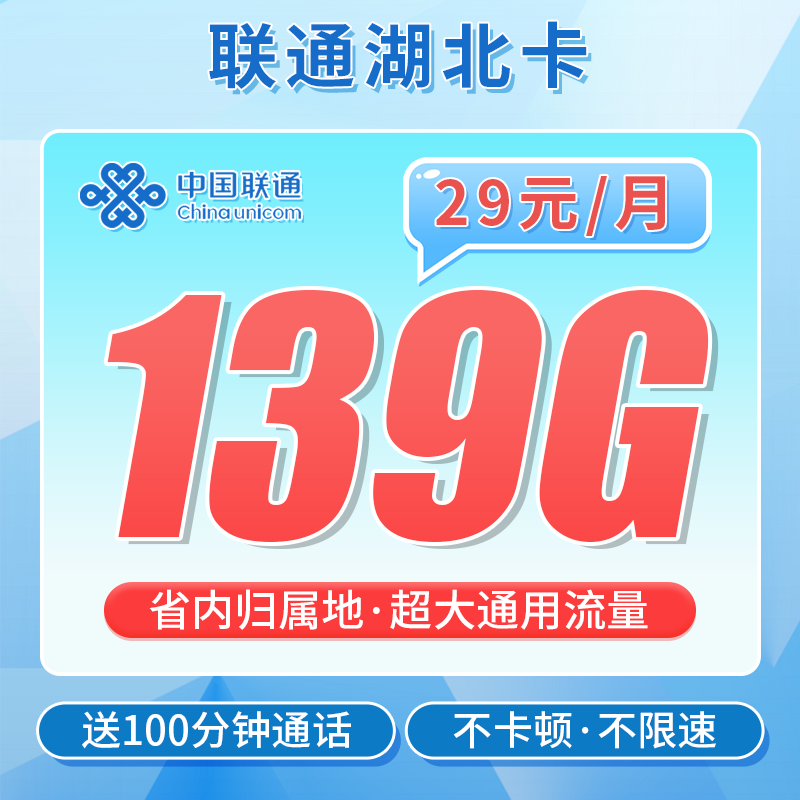 联通湖北卡29元139G+100分钟通话+湖北专属